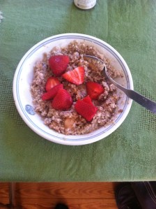 The other day I did a 50 miler and ate a good breakfast about an hour before the ride, of steel-cut oats with Soy milk, peanut butter, and strawberries since the bananas were not ripe. For a non- breakfast eater (BAD BAD me, I know), it was tasty and sat well with me.