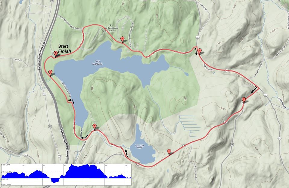 The field of athletes doing the duathlon was quite small, and the first 5k was an out-and-back run through the state park. Rolling hills. I actually wore my garmin watch for the first time in about a year so I could keep track of my pace. Did I remember how to use the watch? Kind of, at least basics. I did not want to sprint to fast and have no energy for the rest of the race. Nine minute or so miles is what I was aiming for. I kept up with Ms. Championships the whole 5k, and felt good after the first run was over. The bike, ohh the bike portion. It was two loops around the park, and, I have come to the conclusion that in order for a race to be one of the New York Triathlon races, it must involve hills. Having not pre-ridden the course, I had no idea what the extent of the hills would be. Below is the image posted on the Facebook page of the race course….