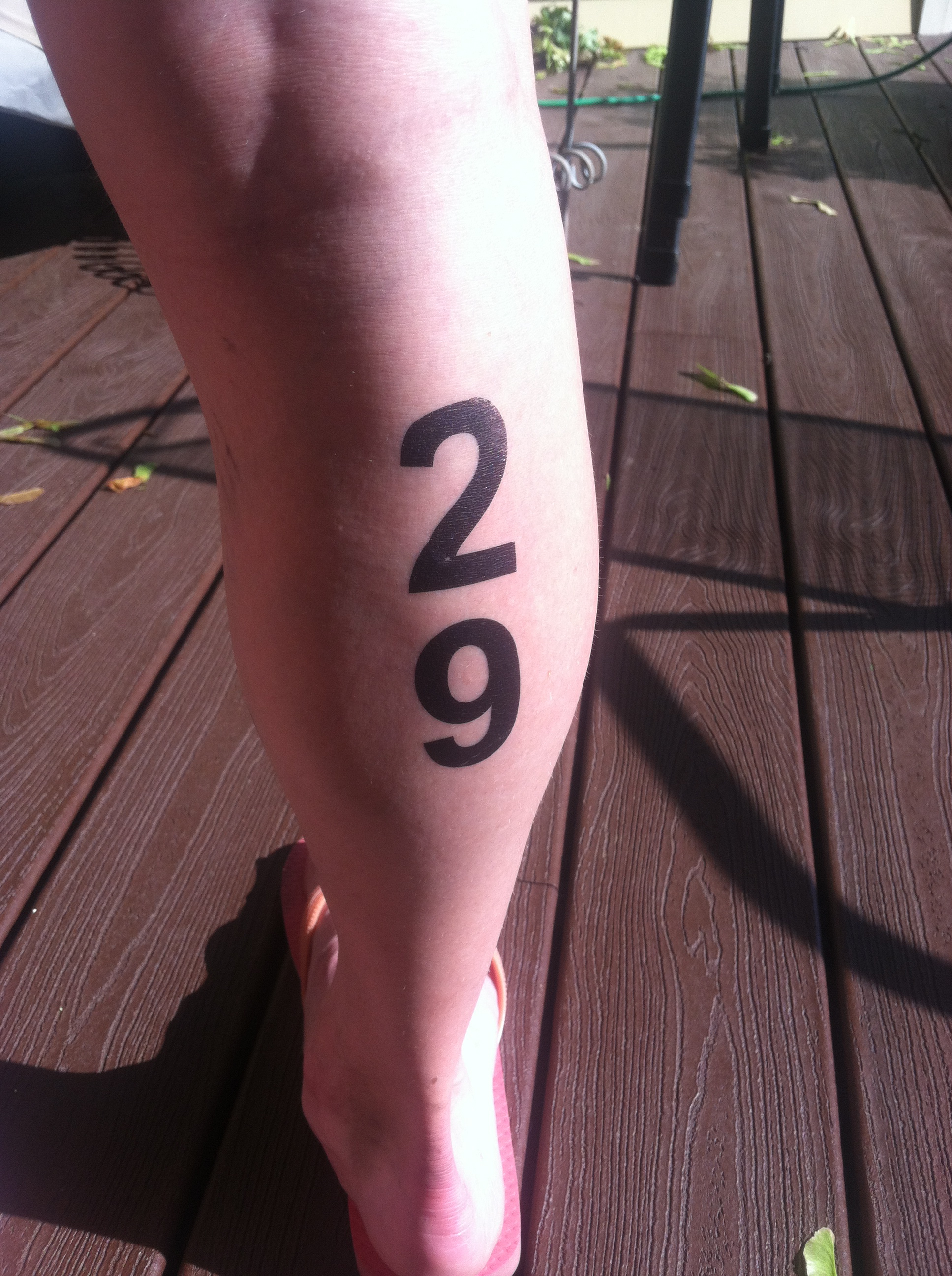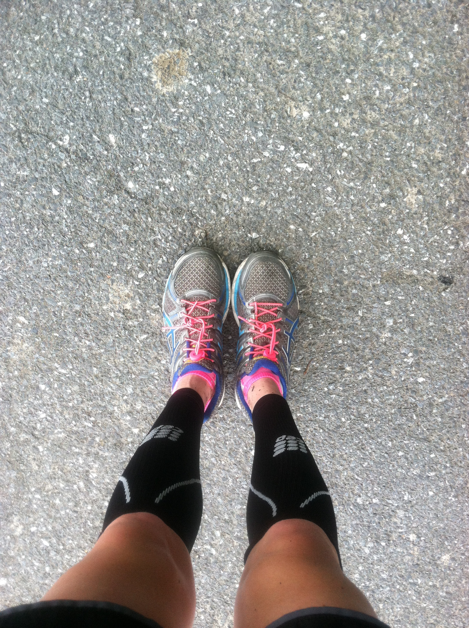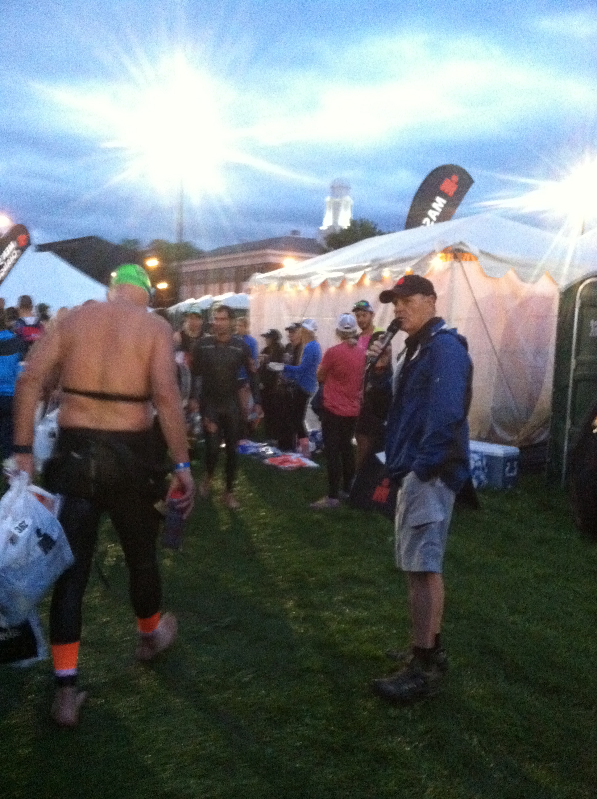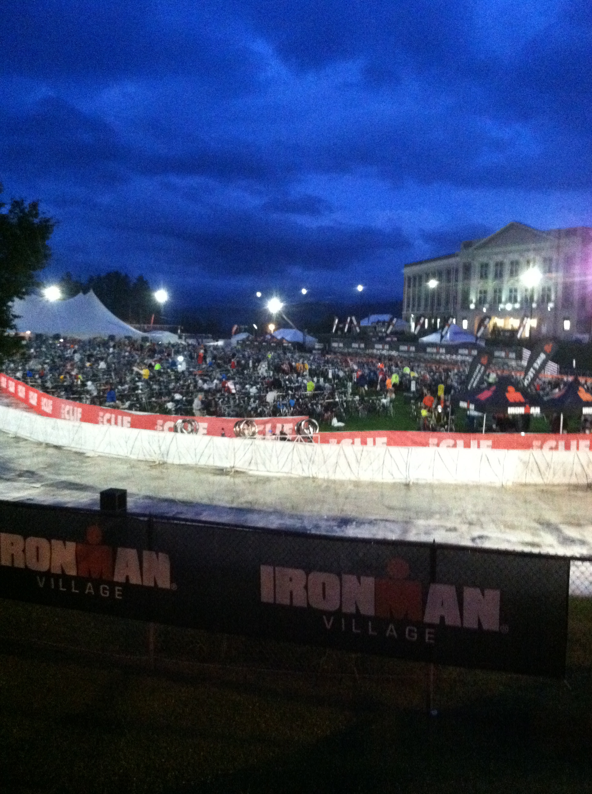 By this time, it was warming up, and I thought it would be a nice time for a shower of some sort to pass by. But, Mother Nature had the rain happen at last years event, not this years. I sat down in the changing tent and a volunteer brought me a cup of water. The volunteer was SO helpful and patient with me! I changed into running shorts and put on a new pair of bright compression calf sleeves (so that I would “stand out” and family could find me more easily). I grabbed my race belt, visor, sunglasses, and a Honey Stinger, and walked outside and asked the Sunscreen volunteers if I could have some sunscreen (i forgot to put it on my legs for the ride–oops). I’ve never had three people apply sunscreen to various parts of my body before! They were dancing and singing– under different circumstances one might see this as some sort of rite of passage in a cult. But in an Ironman, it is totally acceptable to have people smear suntan lotion all over you! I thanked them, and was out of transition.